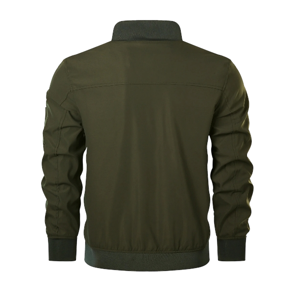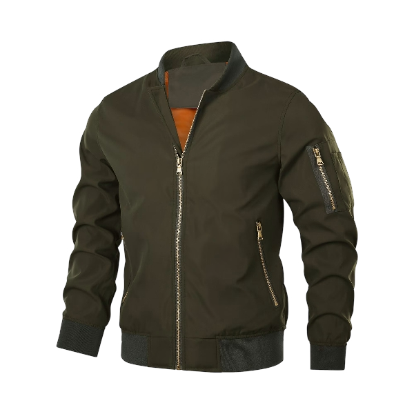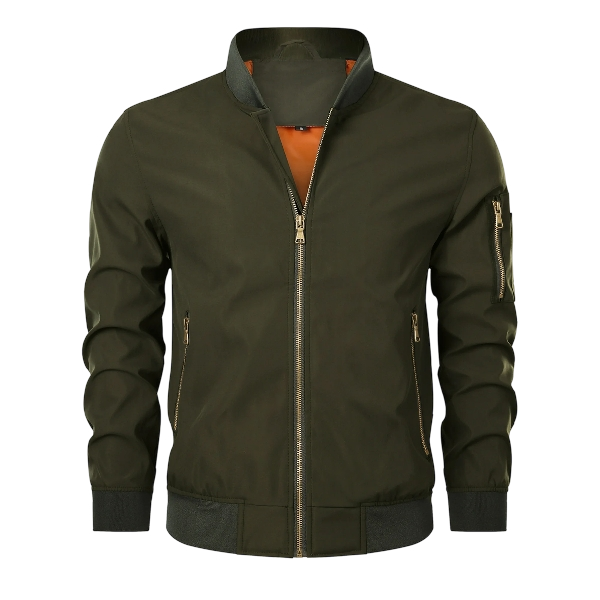 This men’s bomber jacket combines sporty style with everyday comfort. Designed with a full zip closure, ribbed knit cuffs, hem, and collar featuring subtle stripe detailing for a classic finish.