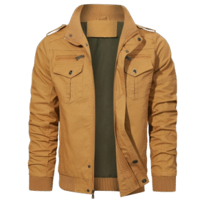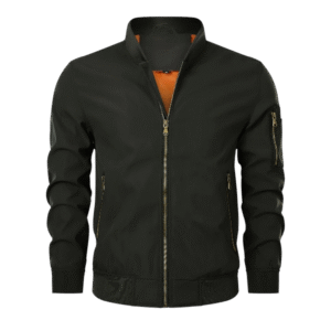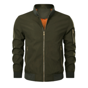 This men’s bomber jacket combines sporty style with everyday comfort. Designed with a full zip closure, ribbed knit cuffs, hem, and collar featuring subtle stripe detailing for a classic finish.